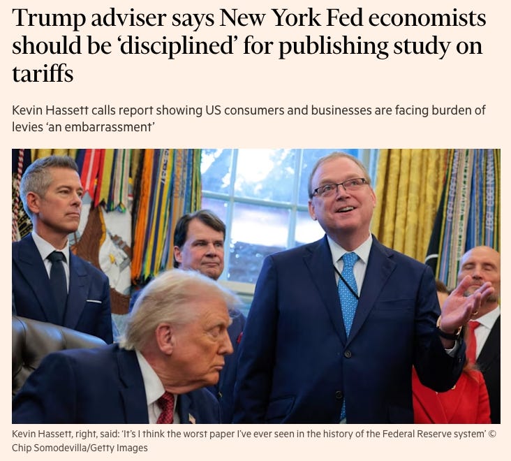 Hassett’s response was not to dispute the findings with evidence, or commission competing research, or even pretend to be having a normal grown-up policy disagreement. Instead, he declared the paper “an embarrassment,” called it “the worst” in the history of the Federal Reserve system, and suggested that the economists involved should be “disciplined.” Not debated or challenged, punished. Apparently the real problem here is not that tariffs raise prices; the real problem is that someone wrote it down.