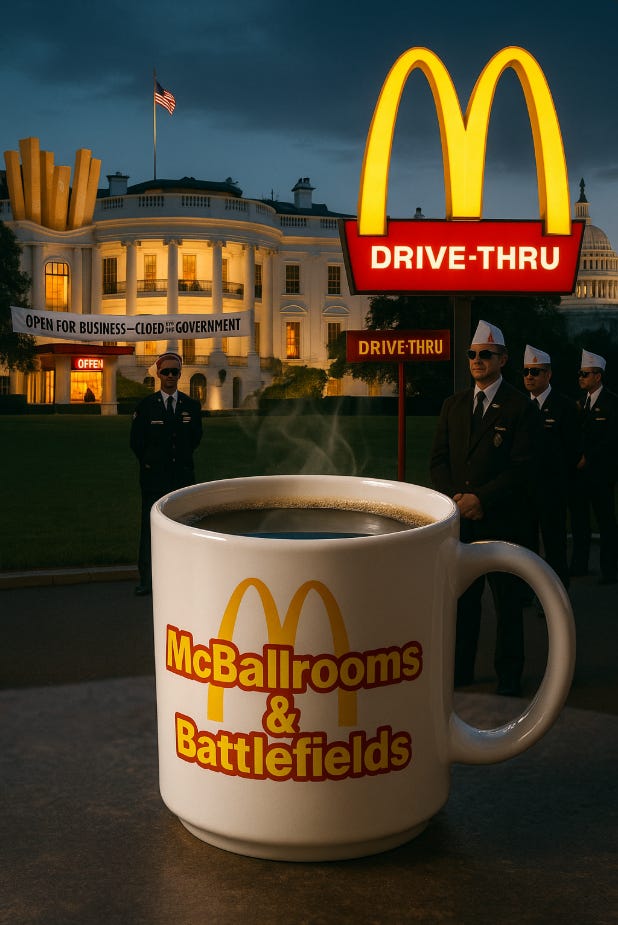 Somewhere between the gilded statue and the glass ballroom, you could almost see it: the man who turned the presidency into a franchise, sketching his own McMonument while aides whisper about how he builds his lunch the way he builds his legacy, layered, oversized, and clinically alarming. Former Florida state senator Joe Gruters spilled that Trump’s midday ritual involves a Filet-O-Fish, a Big Mac, and an orange soda, sometimes stacked into a single Franken-burger. It’s as if he’s decided to honor the original Golden Arches by constructing one in marble and one in his digestive tract. In the end, the entire project feels less like civic architecture and more like a Happy Meal for the ego, collect all three sizes while supplies last.
