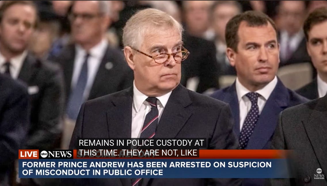 The British have arrested Andrew, formerly known as prince. Andrew Mountbatten-Windsor, formerly Prince Andrew, was arrested on suspicion of misconduct in public office after the release of millions of pages of Epstein-related documents suggested he may have forwarded confidential trade envoy material to Jeffrey Epstein while serving in an official British role.