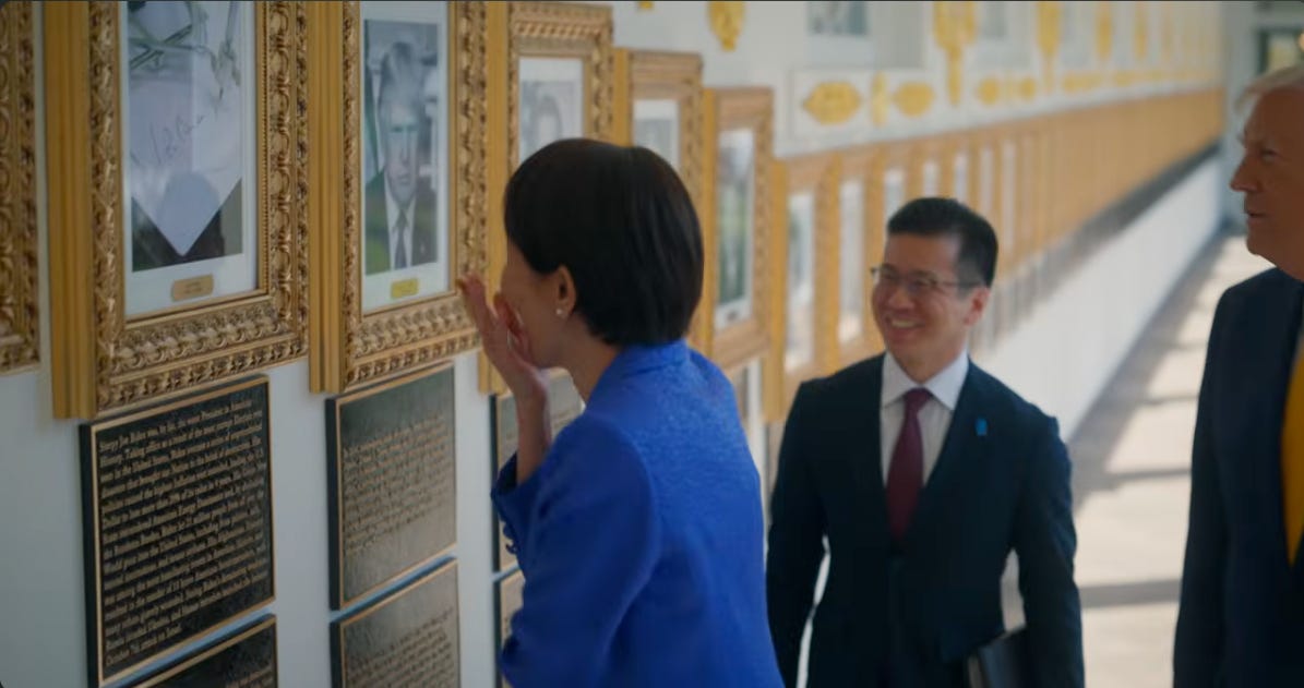What makes this more than mere vulgarity, though, is what happened afterward. The White House then released a glossy promotional video built from the visit, pairing carefully selected audio clips from the earlier meeting with soft-focus imagery of Trump and the prime minister strolling the colonnade, cherry blossoms blooming, and presidential portraits lining the wall. At one point, the prime minister appears to pause and gesture quizzically toward the absurd Biden autopen display Trump has installed there, as if even a visiting ally could not quite miss the fact that the White House has been redecorated as a shrine to Trump’s grievances. But the real tell was the soundtrack. The video lifts the prime minister’s line that “it is only you, Donald, who can achieve peace across the world” and lays it over those stately visuals like a benediction. In context, it was diplomatic flattery. Out of context, it becomes a cinematic endorsement. The rambling, the threats, the Pearl Harbor crack, the incoherence, all of that was cut away. What remained was a carefully polished myth: Trump the peacemaker, Trump the historic figure, Trump the man affirmed by allies and framed by presidential grandeur. Diplomacy was recut into a legitimacy commercial.