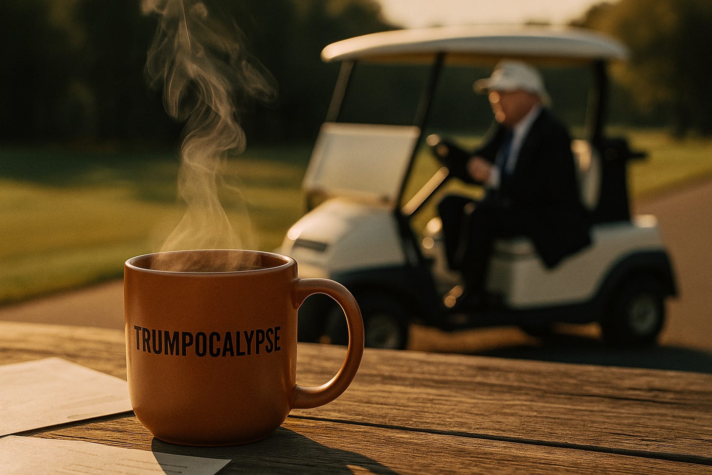 Let’s start with international diplomacy under Trump 2.0. This past weekend, Trump jetted off to Italy for the funeral of Pope Francis, spent all of 14 hours on the ground, squeezed in a 15-minute “peace summit” with Ukrainian President Volodymyr Zelensky inside St. Peter’s Basilica, and then rushed back to New Jersey… to play golf.