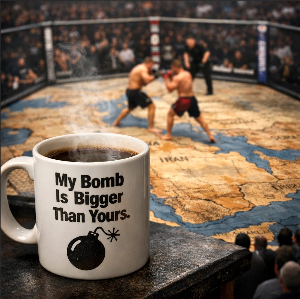 From Hormuz panic to Pentagon piety to a Saturday night UFC fight, Trump keeps turning war, faith, and governance into one long episode of televised male insecurity.