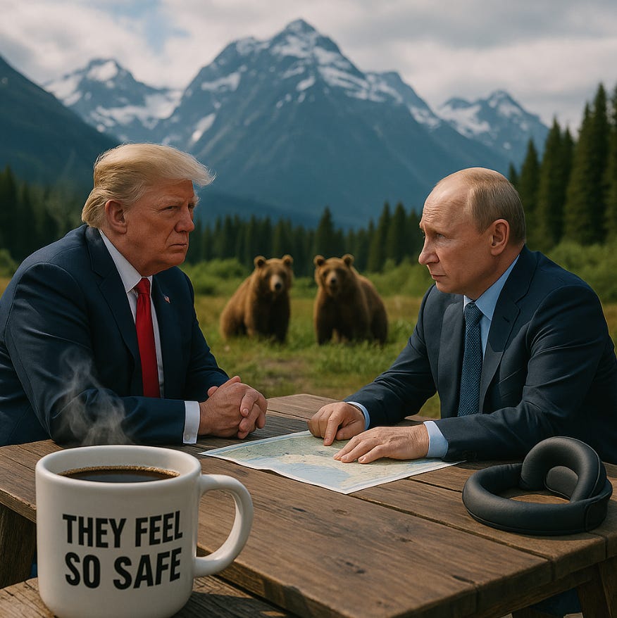 The geopolitical main event is brewing up north: today’s meeting with Vladimir Putin, conveniently relocated to Anchorage, Alaska, where thousands of protesters have been making it clear they do not appreciate authoritarian war criminals setting foot in their state. The signs read like truth serum for international diplomacy: “Putin is a war criminal,” “Ukraine and Alaska - Russia Never Again,” “I can see fascists from my house.” Trump and Putin will meet without Zelensky present, because the plan they’re cooking up, a Gaza-style Russian occupation of Ukrainian land works better without the Ukrainian president in the room to say, “Absolutely not.”