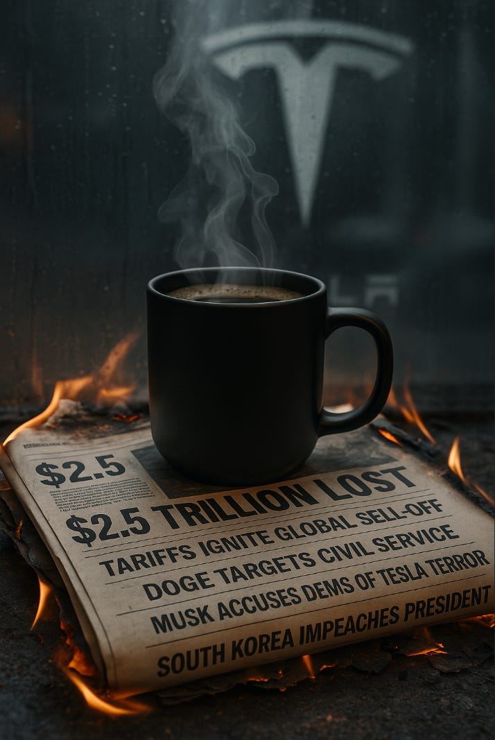 Have a strong cup of coffee. It’s not just a bad day on the markets. It’s a clarifying moment in history. The empire is unwell, its clowns are in control, and its billionaires are tweeting threats at judges. But somewhere in the fog, resistance is rising. The people, eternal, are waking up.