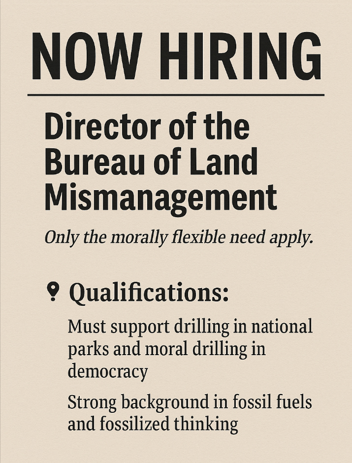 Of course, Trump will find someone else, someone who thinks Mount Rushmore should be replaced with a fracking rig and believes sage grouse are Antifa operatives in disguise. But until then, enjoy the fleeting moment where an oil lobbyist got rejected for being too ethical. In this timeline, that’s what passes for hope.