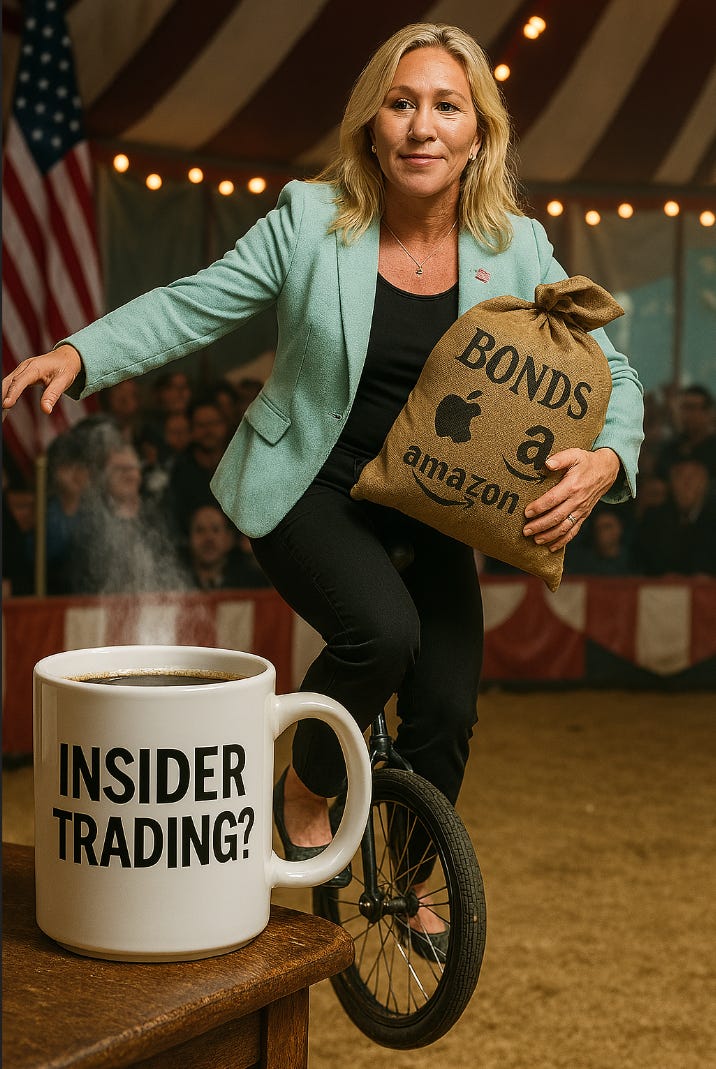 Good Morning. It’s Friday, April 11, and the free market’s favorite game is rigged. In a development that would make Gordon Gekko blush, multiple members of Congress appear to have gone full hedge fund manager, except with better timing and no risk. Take Marjorie Taylor Greene, whose track record for being wrong on absolutely everything has now somehow turned into Warren Buffett-level clairvoyance. In the days before Trump nuked the global economy with his Liberation Day tariffs, MTG loaded up on Treasury bonds and then, as if by divine prophecy or guided by Jewish space lasers, flipped to Apple, Amazon, Dollar General, and Berkshire Hathaway just in time to ride the rebound when Trump reversed course.