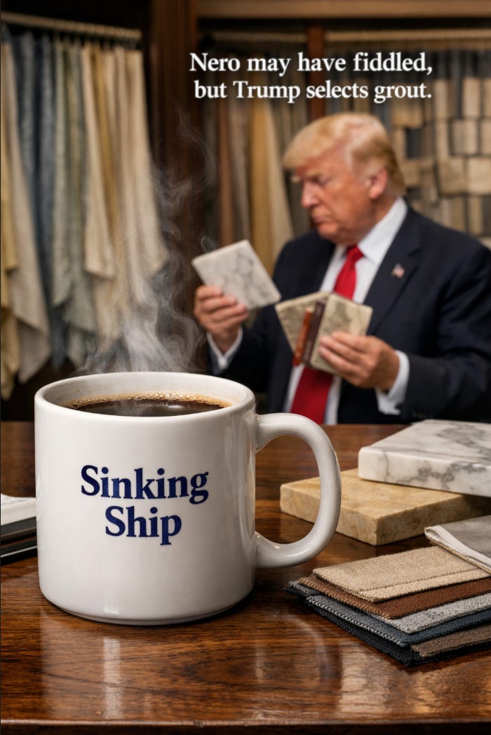 Good morning! Except for Donald Trump, who appears to believe the presidency is a cross between a war room, a donor brunch, a shopping channel for marble finishes, and a grievance podcast with nuclear codes.