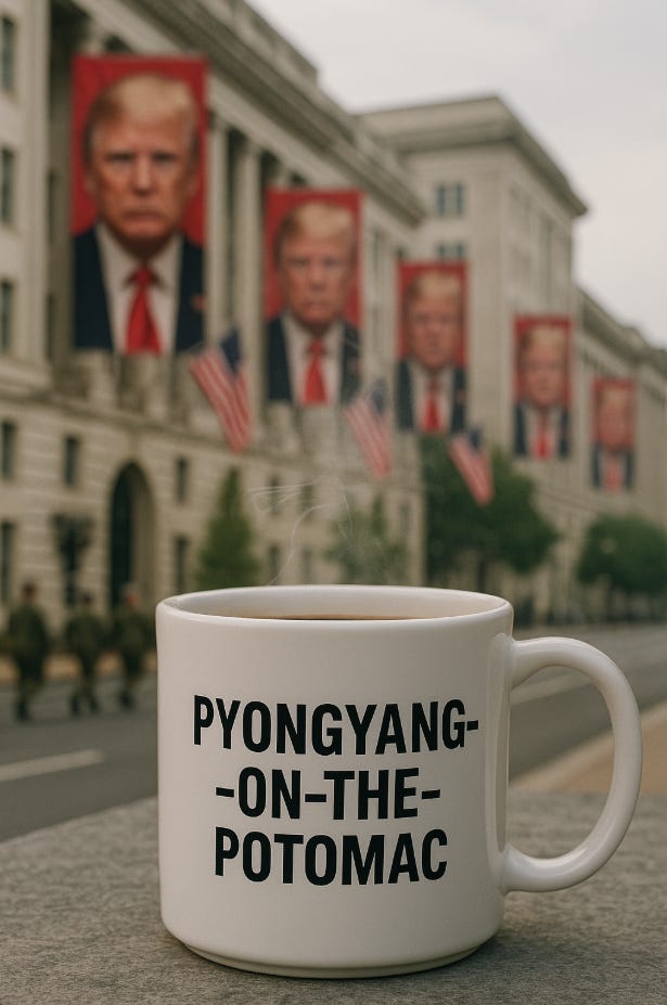 And while Exxon strikes its bargain abroad, parades as a two-bit despot on the home stage. The nation’s capital is now draped with giant banners of his mug-shot-like face, Saddam’s Baghdad meets Pyongyang on the Potomac. The National Guard, once tasked with protecting democracy, now spends its days picking up trash or standing idle for the cameras in Trump’s crime-emergency theater. Inside, a four-hour cabinet meeting descended into parody, with officials thanking “dear leader” for saving college football, resurrecting law enforcement, and generally being the best boss since FDR. One even suggested he deserved a Nobel Prize. The groveling was so absurd it could have embarrassed Kim Jong-un’s ministers.