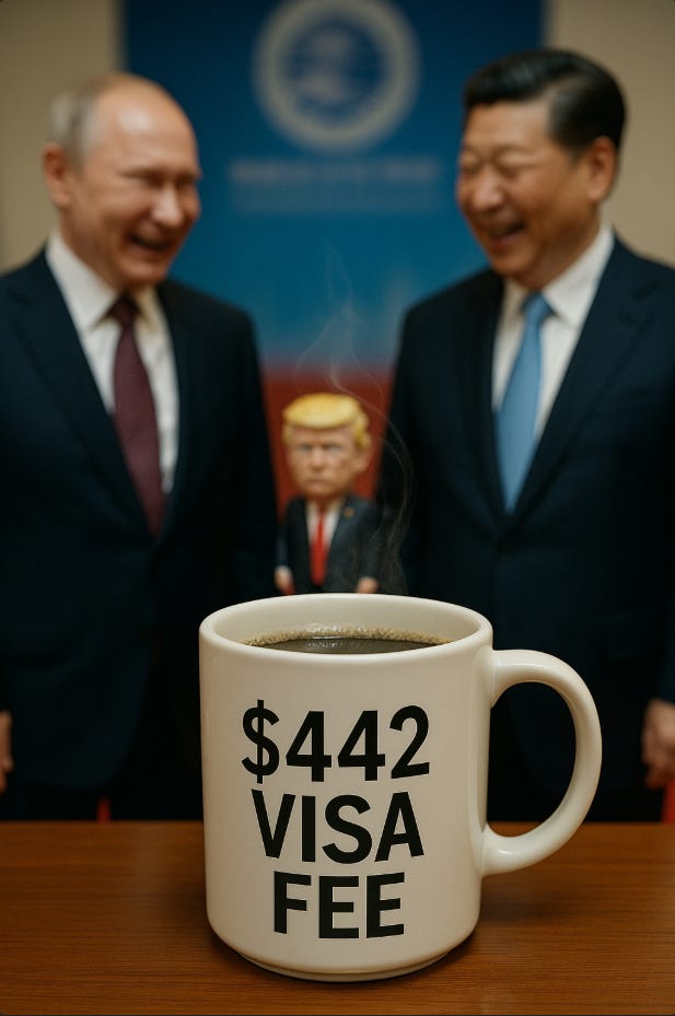 So there it is. Xi Jinping rolls out the red carpet, Putin rolls out the missiles, Trump rolls out visa toll booths and QAnon memes, and ICE agents roll out with masks only to be unmasked by AI. It would be funny if it weren’t so grotesque. America under Trump is shrinking inward, petty and cruel, while autocrats abroad puff themselves up as “architects of a new order.” The world sees it, allies see it, even farmers in Nebraska see it. The only one who doesn’t is the sickly old man with swollen ankles posting death cult memes at three in the morning, insisting he’s winning.
