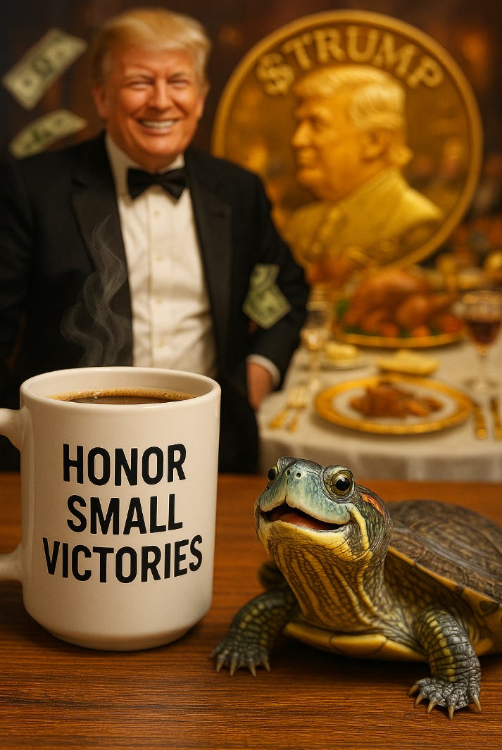 As markets nosedive and courtrooms slam the brakes on his overreach, Trump spins fantasy victories while grifting off crypto bros and alienating the planet. At least the turtles are winning.