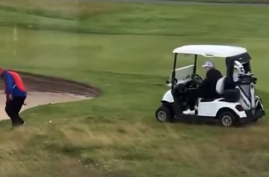But all of that policy pantomime might still have been overshadowed by the day’s most honest moment: Trump, caught on camera during his “working trip,” watching as a staffer discreetly tossed his golf ball out of the rough and onto the green. He stepped out of his golf cart seconds later and approached the lie like he’d just nailed the approach shot of the century, because of course he did.