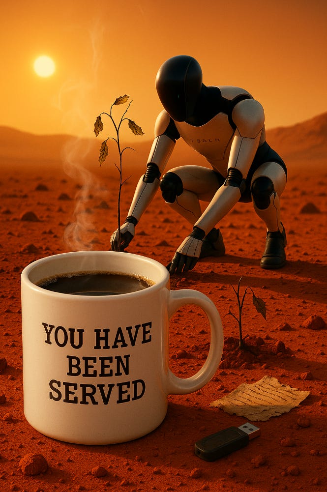 So naturally, we’ll close with some levity. Because while Donald Trump scrambles to redact the truth, suppress surveillance tapes, and whisper sweet immunity deals into Ghislaine Maxwell’s ear, and while RFK Jr. plays public health arsonist with a flamethrower full of pseudoscience, Elon Musk is planting trees on Mars.
