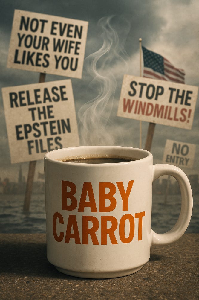 And through it all, Trump is golfing. On the taxpayer dime. At a resort in Scotland that was picketed by locals holding signs like “Not Even Your Wife Likes You” and “Release the Epstein Files, Baby Carrot.” Honestly? It’s hard to argue with the Scots.