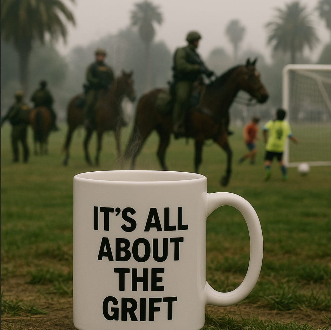In the real world, armored immigration agents on horseback stormed MacArthur Park in Los Angeles, turning the heart of immigrant L.A. into a campaign photo op for Trump’s reelection machine. Kids’ summer camps became backdrops for men with rifles and tactical gear while parents screamed and street vendors packed up their carts, the community terrorized for a day so the president could prove he’s “tough on immigration.” Mayor Bass demanded they leave, activists warned this was “just the beginning,” and ICE, emboldened by Trump’s new deportation budget, promised they’d be back. Los Angeles, the Ellis Island of the West, was chosen precisely because of who lives there, and what they represent. This is not immigration policy; it’s state-sponsored fear theater.