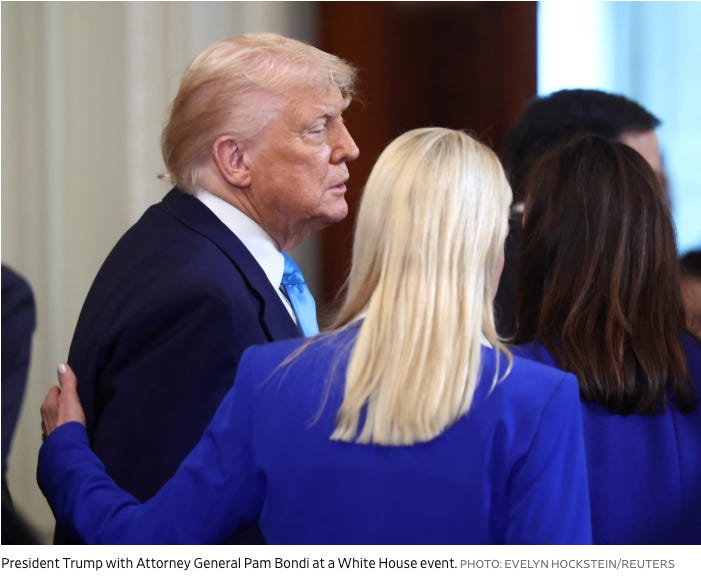 Thanks to The Wall Street Journal, we now know what Trump knew and when he knew it. Back in May, Attorney General Pam Bondi and her deputy Todd Blanche, both handpicked loyalists, sat down with Trump in the White House and told him point-blank: his name appears multiple times in the Epstein documents. Not once. Not vaguely. Multiple times.