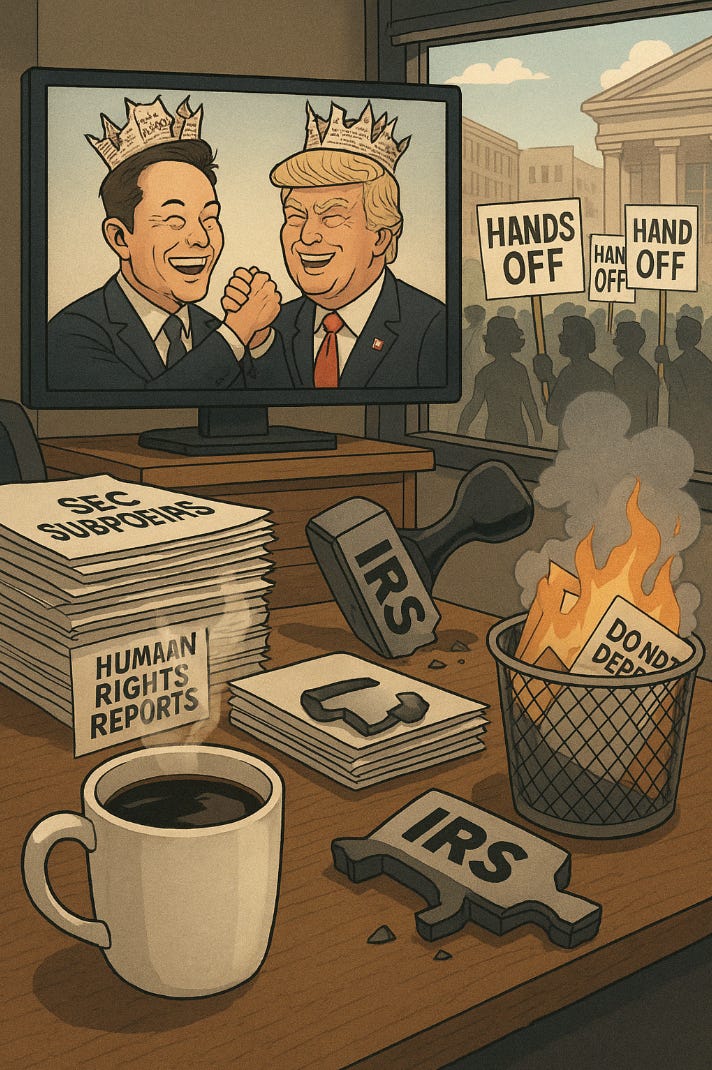 Which brings us to today’s breaking scandal: Elon Musk is now under multiple federal investigations. First, the SEC is suing him for failing to disclose his Twitter stock purchases in 2022, a delay that saved him $150 million while other investors sold in ignorance. Second, the GAO is probing DOGE’s influence in hollowing out the SEC itself. And third, the GAO is also auditing DOGE’s access to sensitive federal agency systems, Treasury, Labor, Education, noting that many operatives are tied directly to Musk’s companies and have zero public-sector experience. Meanwhile, Senator Jeanne Shaheen is pushing a bill to ban companies owned by “special government employees” like Musk from receiving federal contracts. But don’t expect accountability. As the commentary goes: in America, these days, the rules are more like requests.