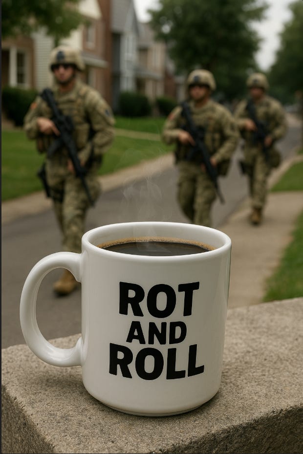 So here we are: a rotting strongman dragging his cankles across the fairways, a smarmy vice president shrugging off Russian attacks on American property, soldiers with rifles patrolling the nation’s capital, voters gerrymandered into oblivion, immigrants treated as props in a cruelty pageant, and a tech messiah who can’t get his robo-taxi out of the parking lot. Dangerous times, absurd times, and above all revealing times. The machinery of Trumpism is marching forward, armed, gilded, and grotesque, while its leader limps into history insisting he’s at his peak.