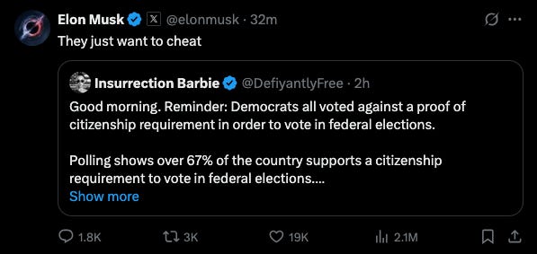 Elon Musk, a man who’s turned lying into both a business model and a political ideology, would like you to know that Democrats are cheating. Why? Because they voted against a Republican proof-of-citizenship bill already redundant under federal law, so obviously, they’re plotting a grand scheme to rig elections with imaginary undocumented voters. And what does our resident Orwellian space-lord do? He amplifies a post from someone calling herself Insurrection Barbie, a woman who looks like she stormed the Capitol and then blamed it on Antifa, and he adds with all the subtlety of a blunt crayon: “They just want to cheat.”