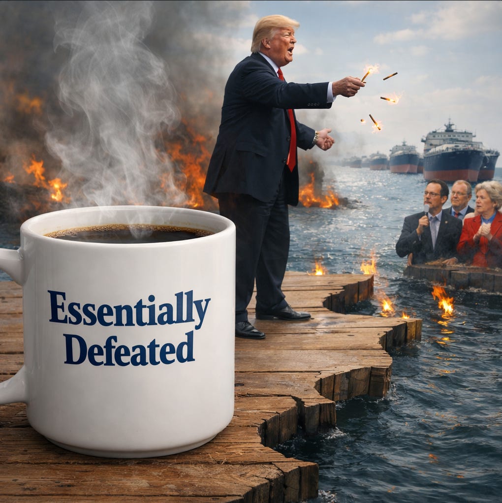 This morning’s picture is grim and absurd in equal measure. Trump is trying to sell military escalation as victory, economic disruption as leverage, alliance blackmail as leadership, and legal defiance as executive strength. What he wants is the prestige of unilateral action with the convenience of shared liability. He wants to swagger through the rubble like a conquering emperor while handing everyone else the invoice for the fire damage, demanding that NATO prove loyalty by joining a war he chose, that China help stabilize an oil route he helped destabilize, and that the Supreme Court sit quietly while he rewrites tariff law with a Sharpie and a tantrum. Through all of it, he still expects the world to look at this carnival of aggression, confusion, and ego and call it strategy.