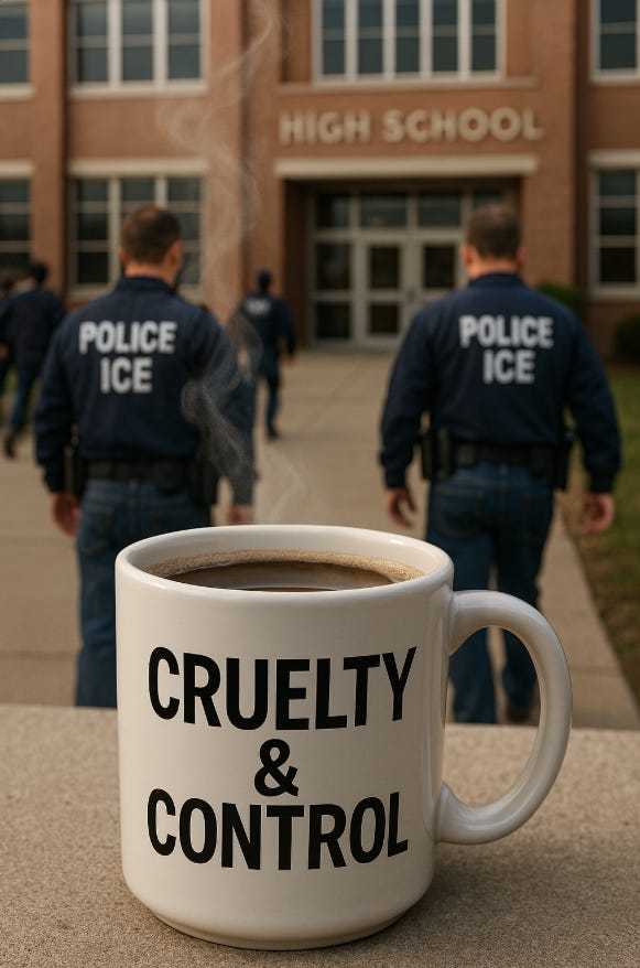 So here we are, in Trump’s America: kids in cages, schools turned into ICE trapdoors, democracy redrawn with Sharpies, and DC’s cops treated like his private militia. And overhead, the planet itself is raging in 160-mile-per-hour winds. But hey, at least Gavin Newsom is trolling the troll-in-chief into a sputtering meltdown. Maybe ridicule won’t save us from authoritarianism or climate collapse but it sure feels good to watch Trump lose the one fight he thought he’d already won: the fight for attention.