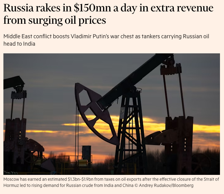 The result is that while American families pay more to fill their tanks and businesses absorb the cost of higher shipping, Russia gets to enjoy something much nicer: renewed fiscal oxygen. And not in some vague, theoretical sense. According to the reporting, Moscow is pulling in an estimated $110 million to $160 million a day in extra budget revenue from the oil shock, with a total windfall of roughly $1.3 billion to $1.9 billion in just the first 12 days. If prices stay elevated, that could rise to something like $3.3 billion to $5 billion over the month. This is not a neat little economics sidebar for Bloomberg addicts and terminally online policy nerds. Oil revenue is war revenue. Every extra dollar flowing into Russian state coffers helps cushion the pressure that sanctions were supposed to create. Every spike in crude prices gives Moscow more room to fund its military machine, patch budget holes, and pretend the costs of its war of annihilation are manageable after all.