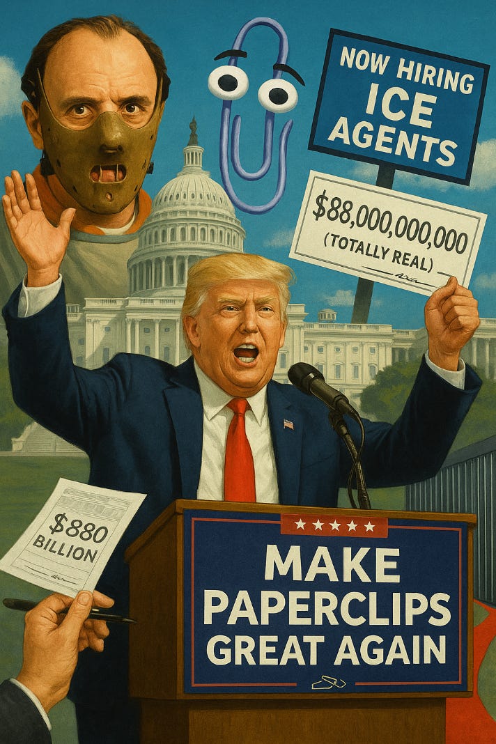 This was a Thursday at the White House. The event was billed as a press conference celebrating Trump’s so-called “Big Beautiful Bill”, a Frankenstein of immigration crackdowns, tax delusions, and cultural grievance. But it quickly devolved into something closer to a Shark Tank pitch for authoritarianism, part home shopping network, part late-stage empire if the host had a felony record and a grudge against reality.