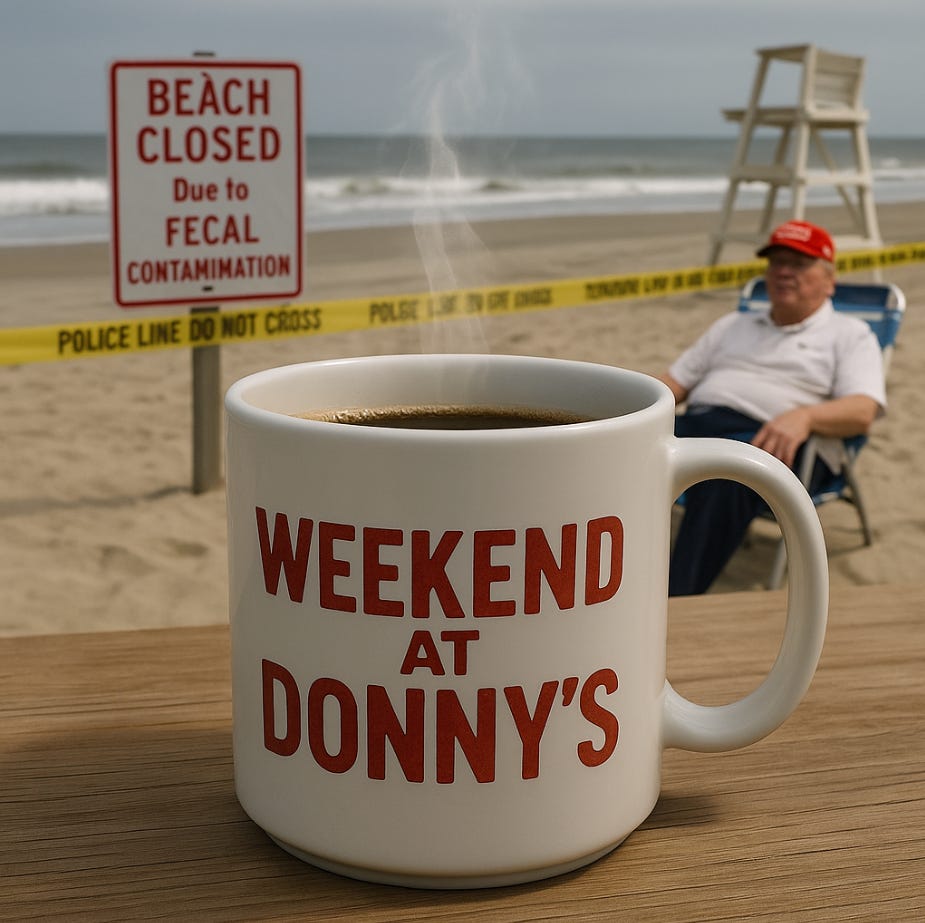 So here we are: a Labor Day defined by sewage beaches, dying unions, neglected diseases, a collapsing CDC, and a president trying to convince the country he’s still breathing with recycled golf photos and bad Photoshop. If this isn’t the metaphor for America in 2025, what is? The water’s unsafe, the health system’s leaderless, the working class is under siege, and the commander-in-chief is either hiding, hallucinating, or both. Happy Labor Day, America. Don’t forget your hazmat suit.