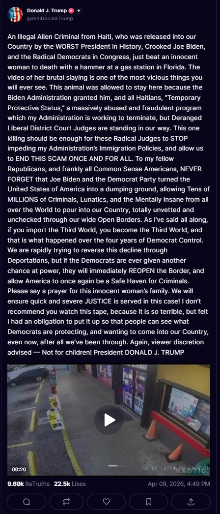 His recent post matters not just because it was obscene, though it was. Not just because it allegedly attached a video of a woman being beaten to death with a hammer, though that alone should stop any decent person cold. It matters because it distills the larger problem into one revolting image. The President of the United States uses horror as political theater. Brutality stripped of context, dignity, or warning and fed into the bloodstream of propaganda. Violence not as tragedy, but as spectacle. The message is not merely that he is indifferent to suffering. It is that he finds suffering useful.
