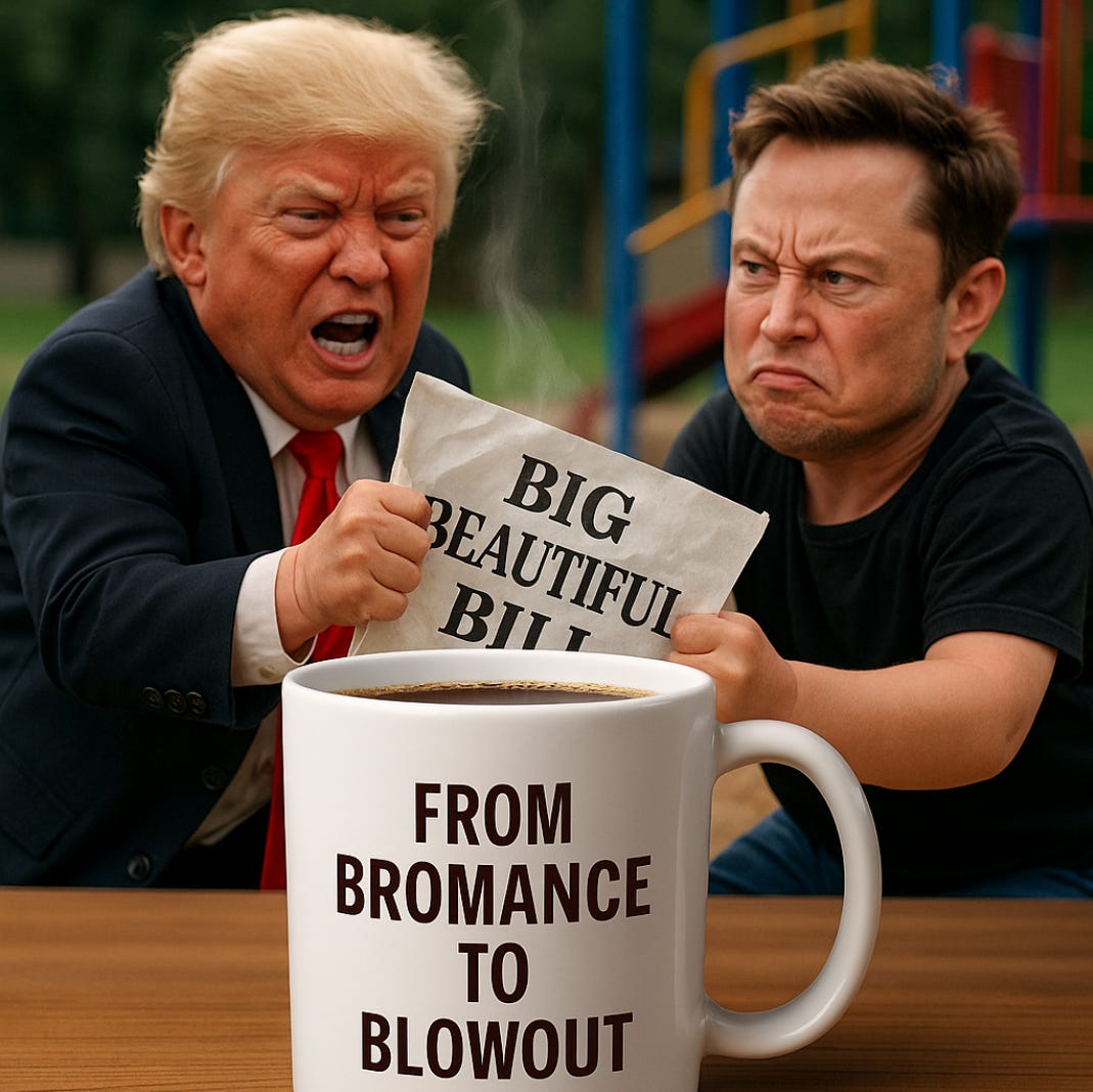 Good morning! While I’d have preferred the last five and a half months hadn’t happened, the Trump–Musk meltdown has almost made it worth it. What began as a bromance has become a brawl: one week Elon Musk is grinning through a White House photo op, the next he’s calling Trump’s signature legislation a “disgusting abomination,” accusing him of hiding Epstein files, threatening to start a new political party, and, yes, fielding offers of asylum from Moscow.